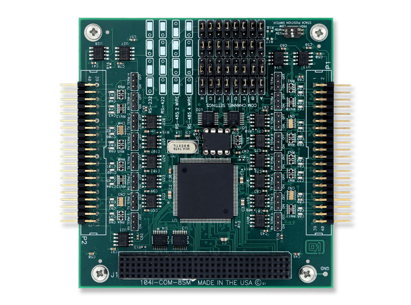 The 104I-COM-8SM family of boards are supported by all operating systems as standard serial ports. All boards include a free DOS, Linux and Windows XP -> 10, both 32 & 64 bit compatible software package with sample programs and source code in “C” and Pascal for DOS, and Visual Basic, Delphi, C#, and Visual C++ for Windows. Also provided is a graphical option configuration program in Windows. An easy-to-use Windows terminal program simplifies verification of proper operation. Linux support includes installation files and samples for register-level programming in “C”.