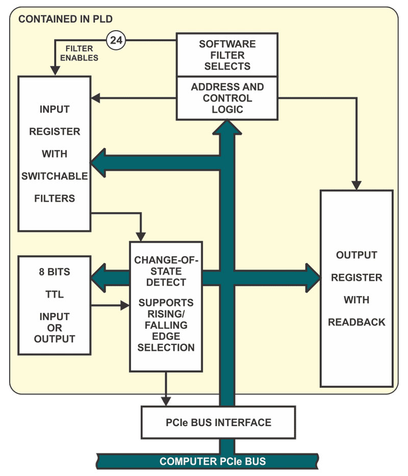 ● Interrupts: Change of State Detection available on all 32 input bits; software enabled in 8 bit groups; byte-wide pattern recognition